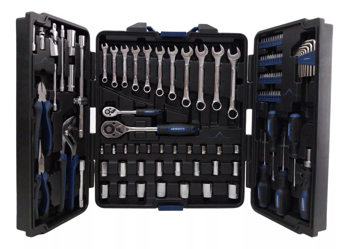 01 Barra de Extensão de ¼” 50mm01 Conexão articulada ¼”01 Conexão articulada ½”01 Barra de extensão ¼” flexível 150mm01 Soquete de Vela com Encaixe de ½” 16mm01 Soquete de Vela com Encaixe de ½” 21mm01 Adaptador de 3 vias ¼ para ½01 Barra de Extensão de “ ¼ 100mm01 Alicate de Corte 6”01 Alicate Bomba D’Água 9,5”01 Alicate de Bico 6”01 Barra de Extensão de ½” 125mm11 Chaves Combinadas01 Catraca Reversível com encaixe de ½”01 Catraca Reversível com encaixe de ¼”11 Soquetes com Encaixe de ¼15 Soquetes com Encaixe de ½40 Bits variados 25mm08 Chaves Hexagonais02 Chaves de Fenda02 Chaves de Phillips01 Chave Multiuso Catraca01 Maleta